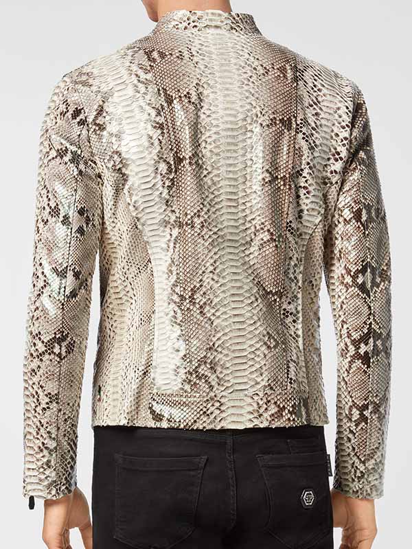Made from high-quality leather, this jacket features a unique and eye-catching snakeskin texture, the jacket adds an edgy appeal to any outfit. Additionally, the jacket features a front zip closure with a stand-up collar that can also be snapped down for a different style.